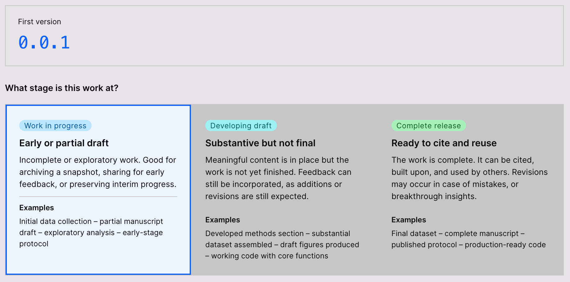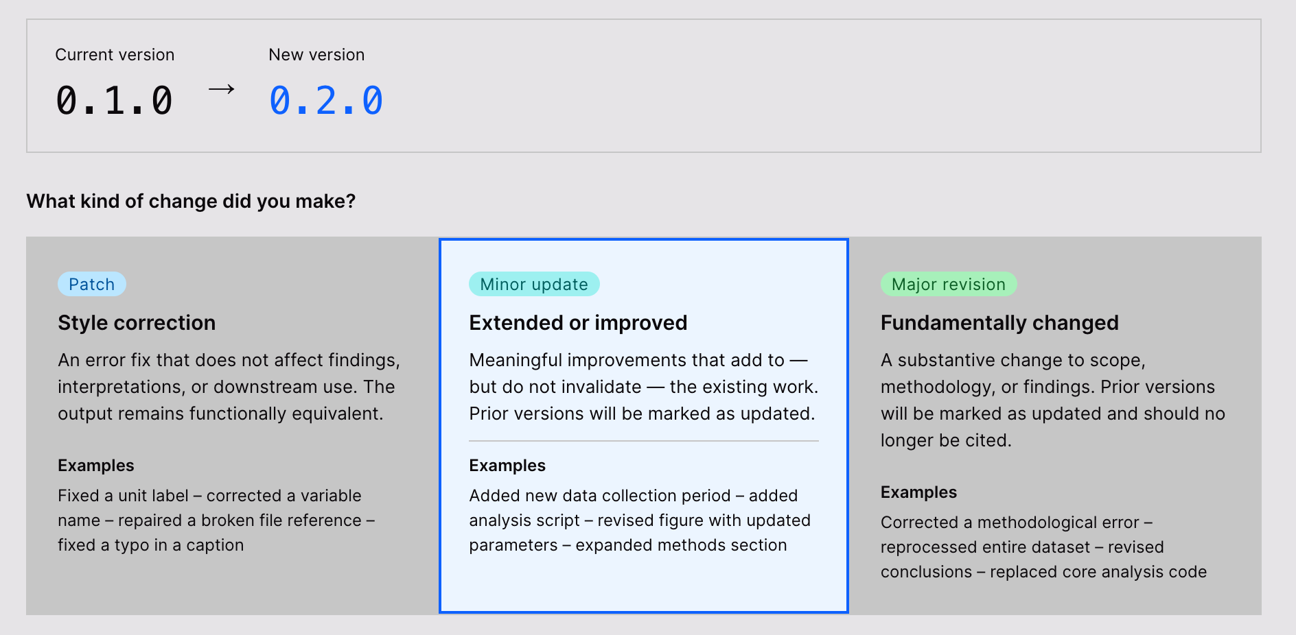 When you publish a new output on ResearchEquals, you can set the version number using Semantic Versioning. Instead of version numbers that increase by one every time, Semantic Versioning provides three numbers for each output in the format MAJOR.MINOR.PATCH (e.g., 1.0.0). Each patch version adds aesthetic changes; minor versions extend the work, and major versions are superseding stable release. This means that everything before a major version 1.0.0 can be considered a draft.